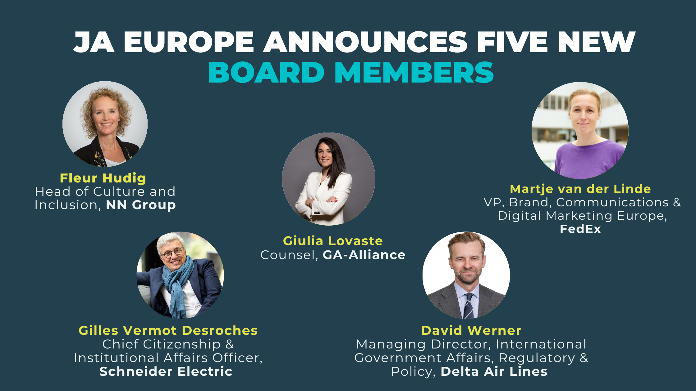 JA Europe is pleased to announce the appointment of five new members to its Board of Directors, bringing senior leadership expertise from leading European and global companies across finance, law, transport, logistics, energy, and sustainability and aviation, all with strong business–education collaboration experience.
